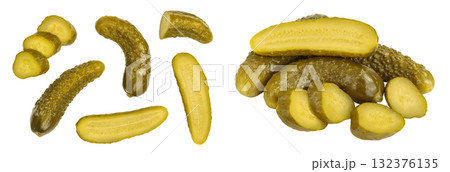 Marinated pickled cucumber isolated on white background with full depth of field. Top view. Flat lay