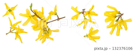 Forsythia yellow flowers blooming isolated on white background. Top view. Flat lay