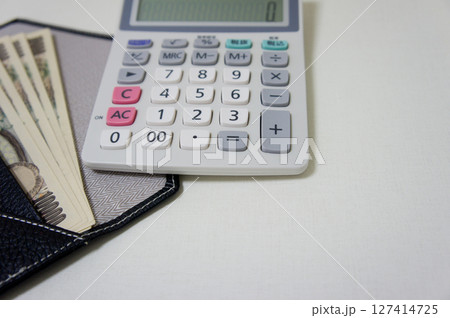 桌上的計算器和裝有 10,000 日元鈔票的錢包