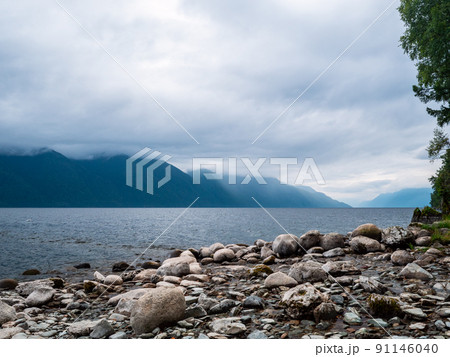Beautiful highland mountain lake with fir forest on the shore and snow covered mountain range in distance