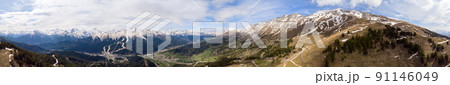 Panoramic landscape view, snow covered mountain peaks on mountain range.