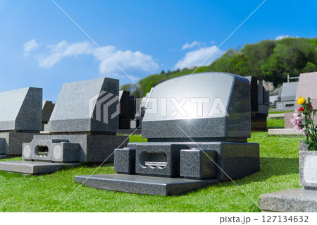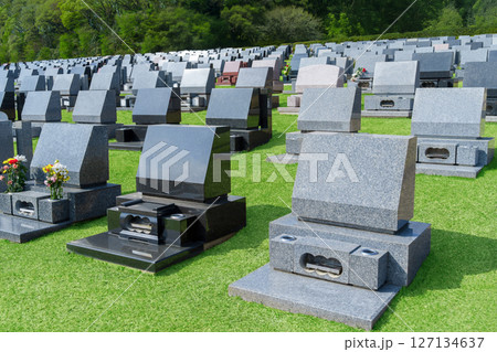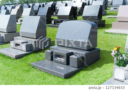 草坪墓園裡的西式墓碑。在陽光明媚的日子裡,廣闊墓地的風景照。