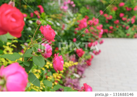 盛開著荊芥和薔薇的花園步道和樓梯(綾瀨市高野公園綾瀨玫瑰園)