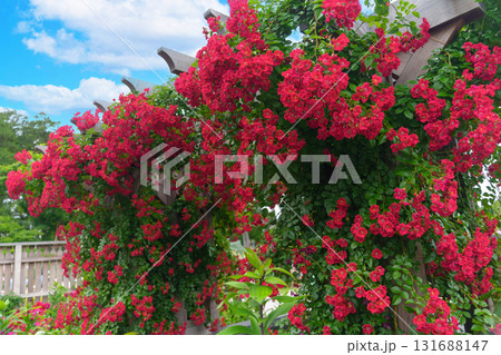 盛開著紅玫瑰的涼亭(神奈川縣綾瀨市廣陵公園綾瀨玫瑰園)