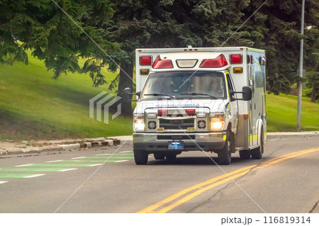 Calgary, Alberta, Canada. Jul 01, 2024. A front view of an ambulance on the road during summer.