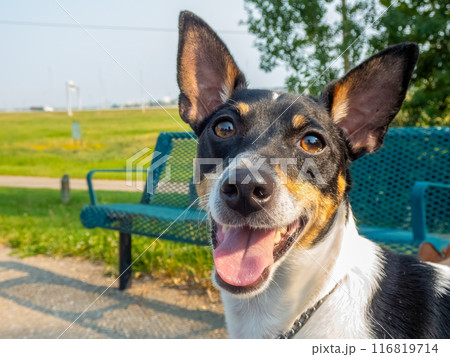A toy fox terrier dog with short fur stands alert in a park next to a green bench. The dog appears friendly.