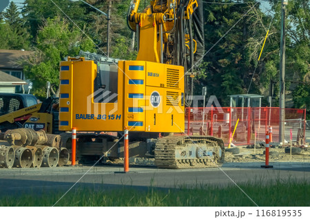Calgary, Alberta, Canada. Jul 12, 2024. A yellow drilling machine parked on the side of a road with a large, tracked base and a tall, slender tower with a drill bit at the top.