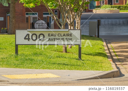 Calgary, Alberta, Canada. Jul 04, 2024. An Eau Claire sign, a neighbourhood in Calgary located immediately north of Downtown.