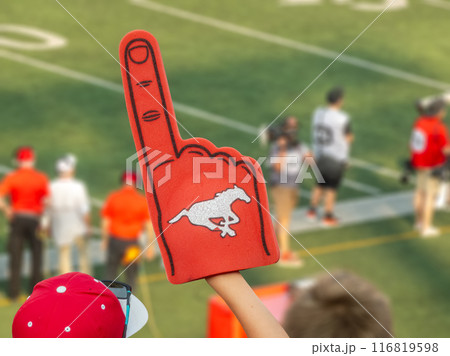 Calgary, Alberta, Canada. Jul 21, 2024. A fan holding a red foam finger with a Calgary Stampeders logo, cheering.