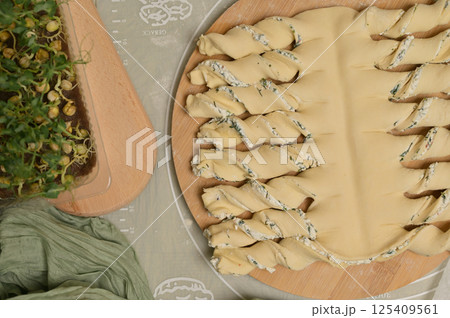 Top view close up twisted dough strips on wooden board. Green towel, microgreens sprouts on kitchen table. Home cooking baking puffs