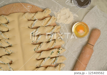 Top view close up twisted dough strips on wooden board. Cutter, egg, rolling pin on kitchen table. Home cooking baking puffs