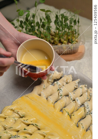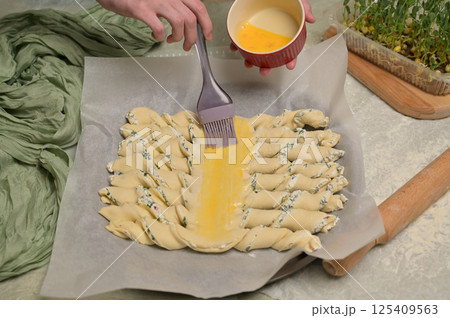 Woman's hands smears yolk on the twisted dough strips with a brush. Red small bowl with egg. Rolling pin, green towel, microgreens sprouts on kitchen table. Home cooking baking puffs