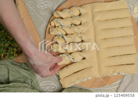 Top view woman's hands twists dough strips on wooden board. Cutter, egg, green towel, microgreens sprouts on kitchen table. Home cooking baking puffs