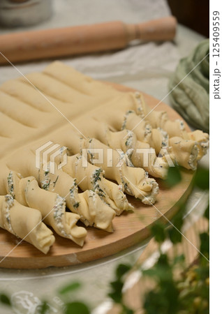 Close up twisted dough strips on wooden board. Green towel, rolling pin, microgreens on kitchen table. Home cooking baking puffs