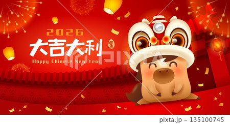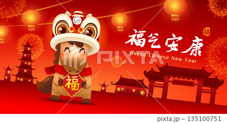 Cute Little Cartoon Horse with Lion Dance on Head. Chinese Zodiac