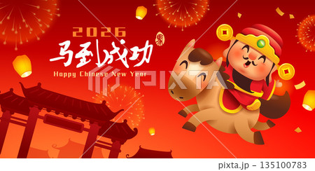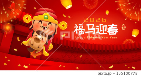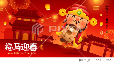 Happy Chinese New Year. A Prosperous Year of the Horse. Cute Little Horse on Chinese New Year Celebration Festive Background.