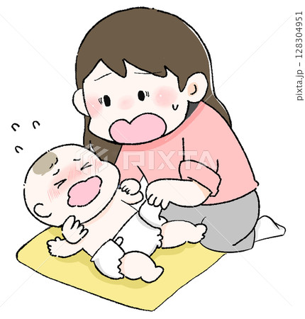 父親匆忙為嬰兒換尿布的插圖育兒Ikumen新生兒護理皮膚護理