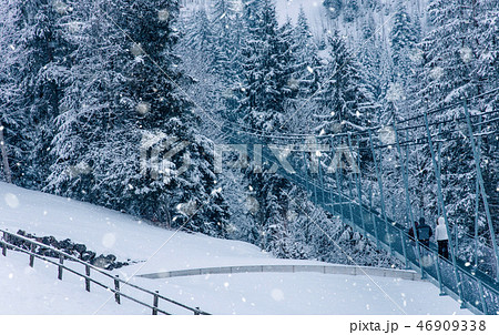 View of snow covered pine forest in Switzerland.