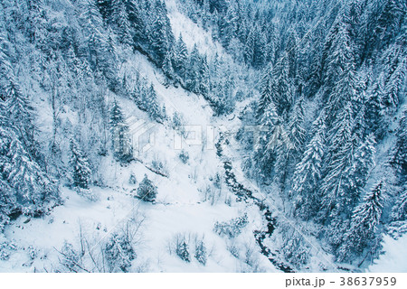 Aerial view of snow covered pine forest in