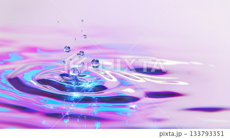 Iridescent water droplets splashing in purple and blue liquid surface
