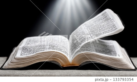 Open bible under dramatic light with turning pages