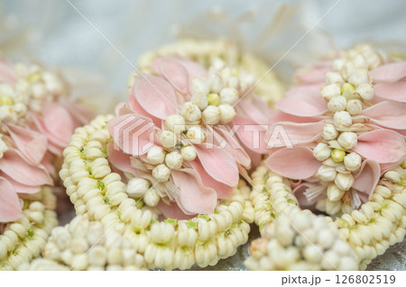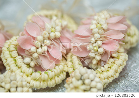 Beautiful Thai-style jasmine garland on a silver cloth background with an ancient Thai pattern.