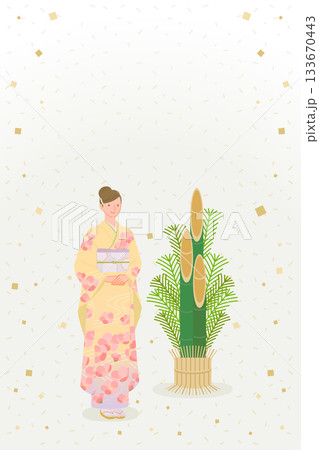 日式新年賀卡設計,圖案為穿著和服的女子和門松。