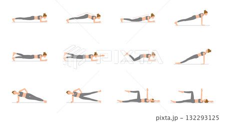 肌肉訓練:年輕女子做平板支撐和死蟲訓練的插圖集