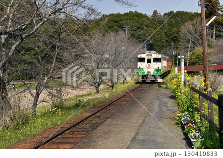 小湊鐵道板部站的黃色油菜花盛開,一輛開往上總中野方向的KIHA40系列列車在此停靠。