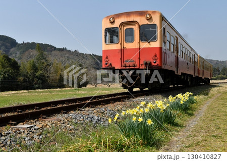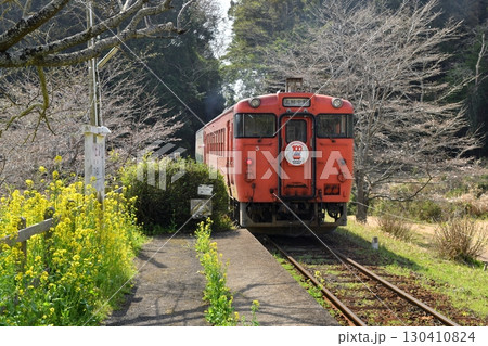 晴朗的春日,小湊鐵道KIHA200系列列車穿過水仙花盛開的石上油菜花田,駛向養老溪谷站。