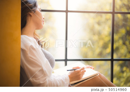 Asian pretty girl writing on book near window.