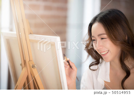 Asian beautiful artist stand near empty frame.