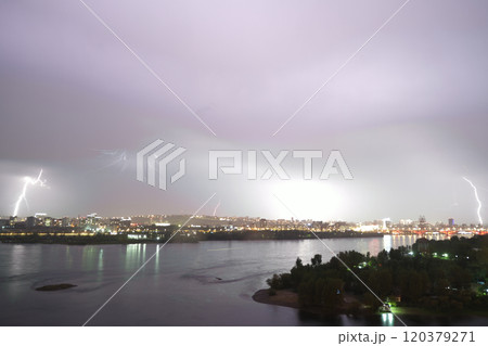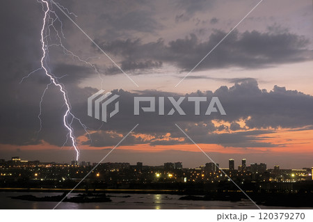Lightning strikes over a city skyline during a dramatic sunset with stormy clouds looming