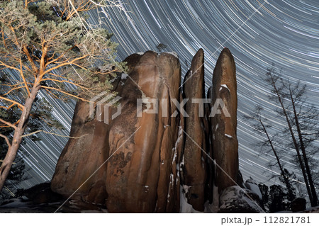 Tracks of stars over the rocks of the Siberian Nature Reserve Stolby in Krasnoyarsk.