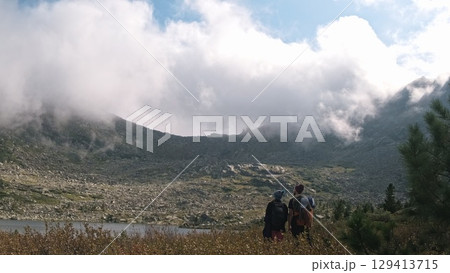 Aerial view of a group of tourists on a mountain trail among high peaks