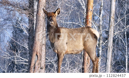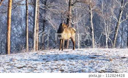 A family of wild marals on the slope of a snow-covered mountain in the Krasnoyarsk nature Reserve Stolby.