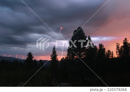 Powerful lightning strikes illuminate a stormy sky at sunset in a mountainous region