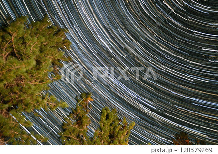 Star trails illuminate the night sky above tall pine trees in a remote forest location
