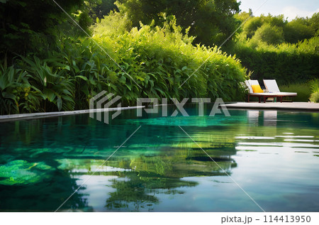 A sun lounger by the pool in a garden surrounded by trees. the clear pool reflects the beautiful shadows of the trees. generative ai