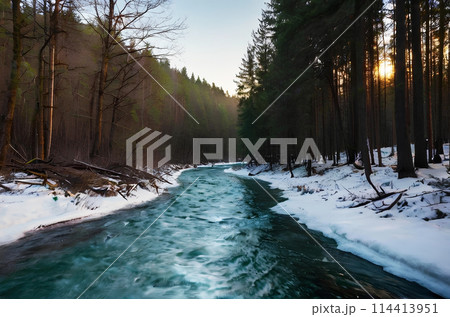 A clear stream flows through a pine forest, with its banks covered in thick snow. Snow is falling, and it's cold in this part of Northern Europe. generative ai