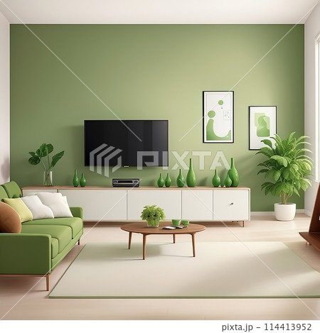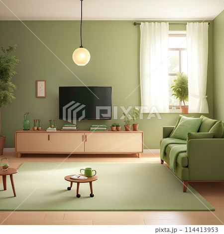 Picture of the living room of a villa next to the beach of the blue sea on a clear day. generative Ai