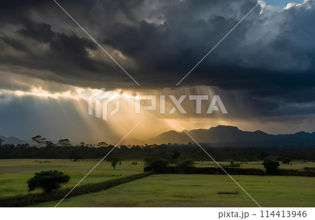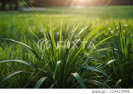 The morning sun shines on the green lawn, The backyard for the background, the meadow grass, The design concept for background. generative ai