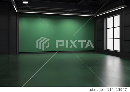 Photo and video studio with black walls, glass windows, black polished concrete floor, dark green backdrop, created with AI, generative AI