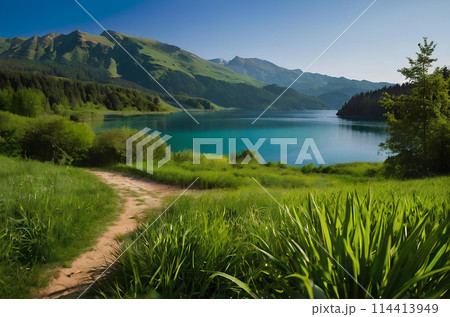 lake in the mountains. The large, clear lake surrounded by tall mountains, bathed in sunlight, creates a sense of calm and relaxation. generative ai