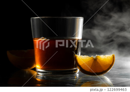 Aromatic amber liquid in a rocks glass with an orange slice, set against a dramatic dark background with swirling smoke
