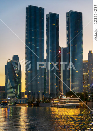 Modern Moscow skyline at dusk featuring tall skyscrapers reflected in the Moskva River. Cityscape, architecture, and urban development