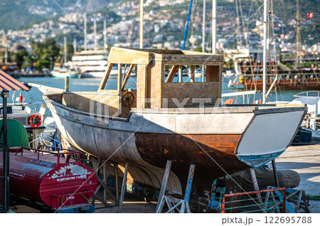 A weathered fishing boat under repair in a bustling shipyard. The hull shows signs of age and wear, contrasting with the vibrant background of other vessels and a city skyline