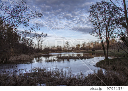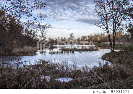 Winter lake with ice and frost in the reeds