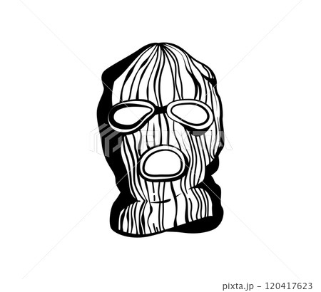Isolated black and white illustration of a balaclava with bold lines and a rough texture