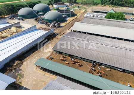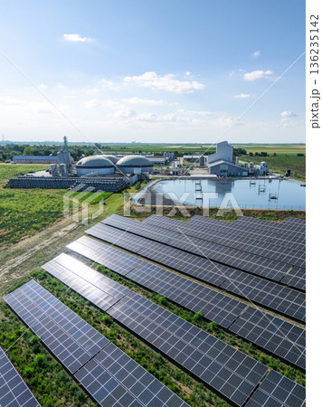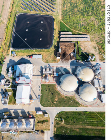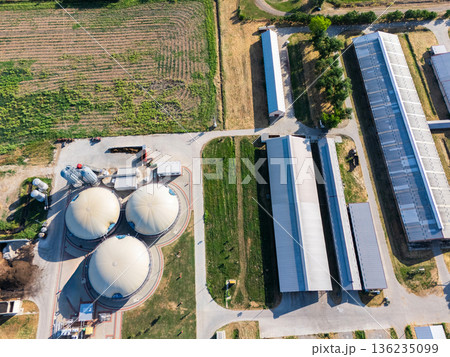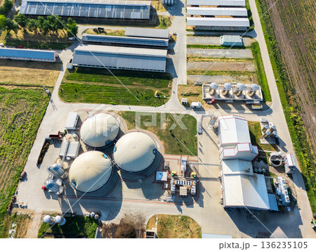 Aerial view of biogas plant using renewable energy for biomethane production.